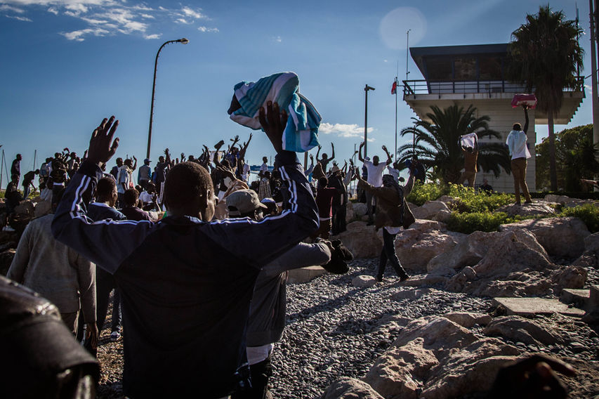 La police empêche la presse de s’approcher maintenant photographes et journalistes à 50 mètres du rassemblement. Après de longues heures d’attente sous le soleil, vers 17h, les migrants s’échauffent et s’élancent par dessus la murette séparant la terre de la mer. C’est la course vers la France qui s’engage sur les rochers ou à la nage.